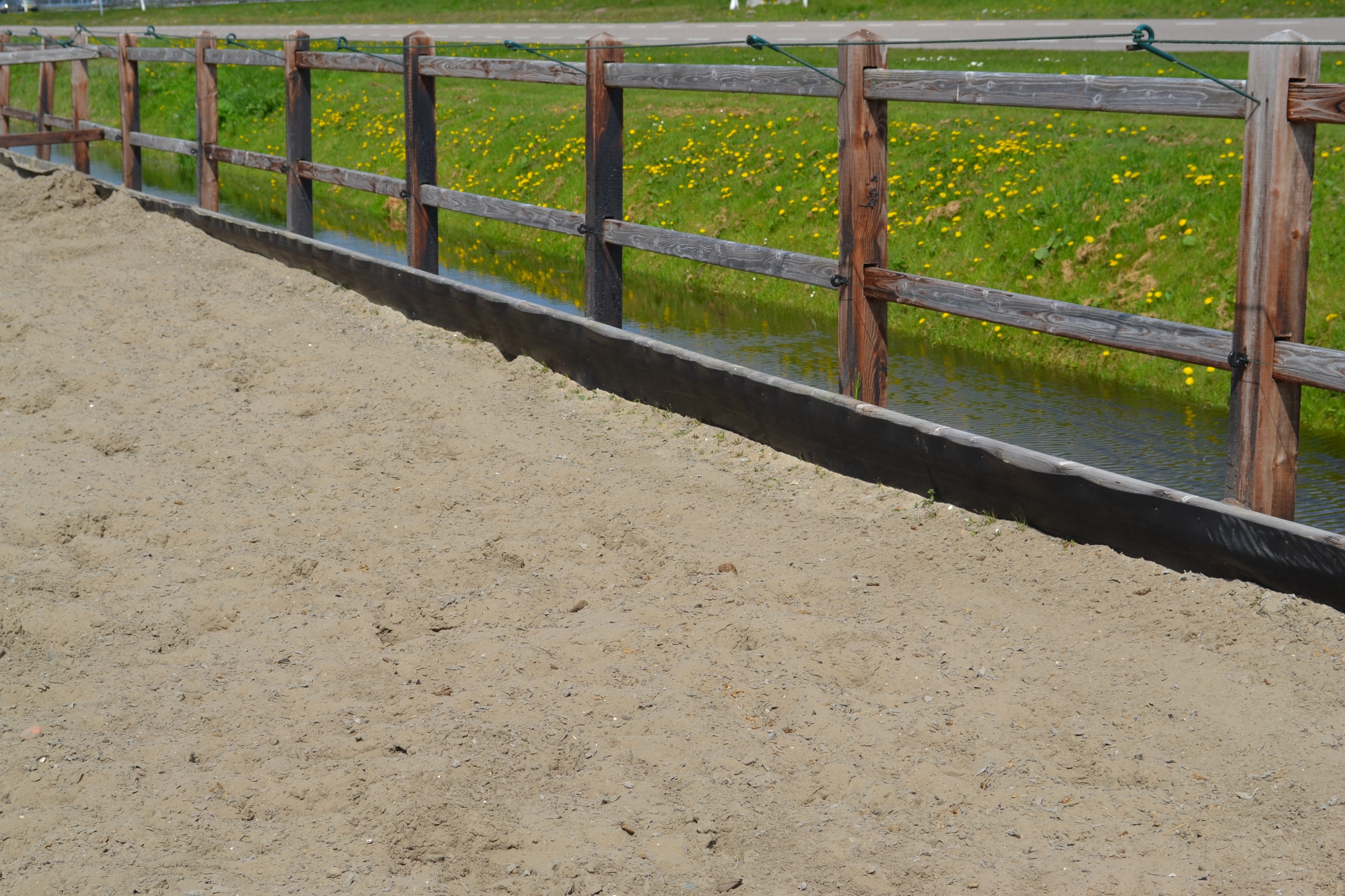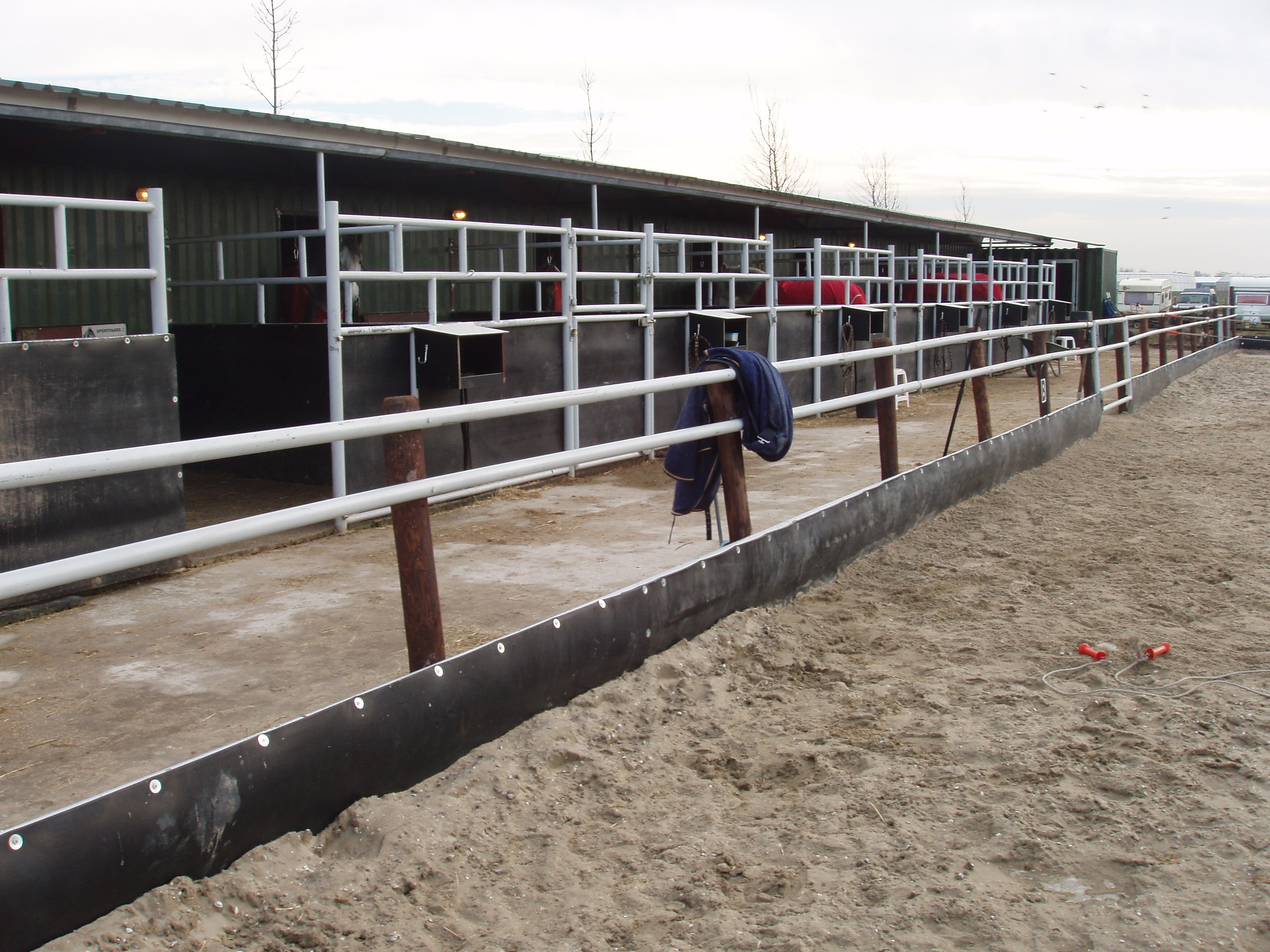 Ideaal om als zandkering te gebruiken is gebruikte rubber transportband, Het voordeel is dat dit goedkoop, duurzaam en beschermend is. Mocht uw paard buiten de bak stappen wordt het beschermd door het rubber, dit is een stuk zachter als hout of kunststof, uw paard zal dus minder snel blessures oplopen.